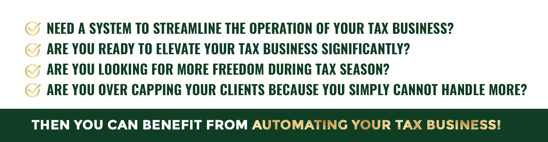 LET THE TAX BIZ AUTOMATOR STREAMLINE YOUR TAX BUSINESS OPERATIONS AND GIVE YOU THE FREEDOM TO SCALE YOUR BUSINESS WITHOUT SACRIFICING MORE OF YOUR TIME OR RESOURCES: